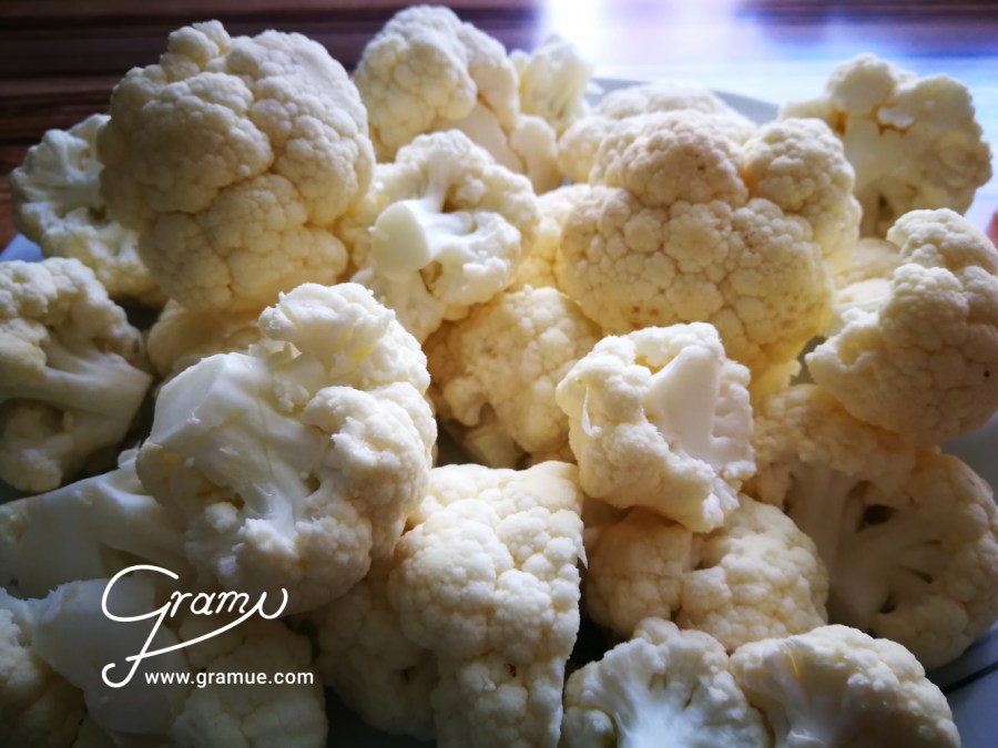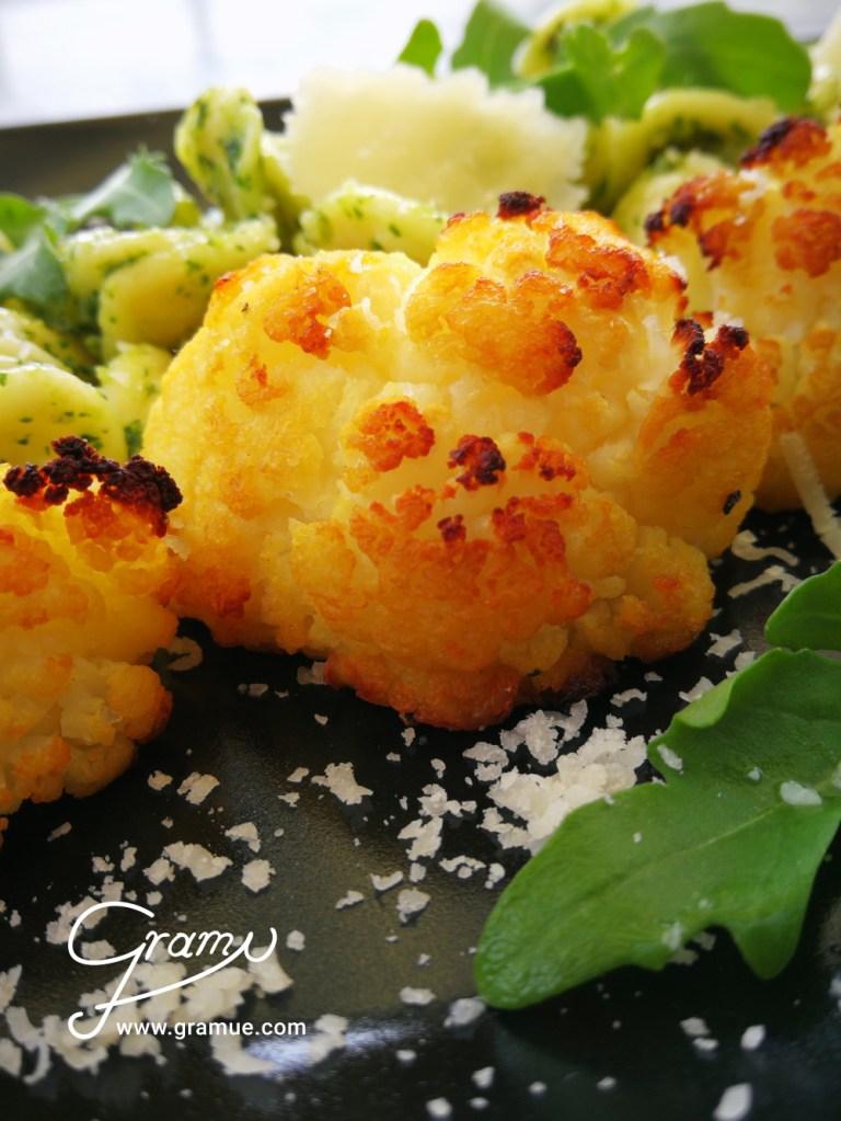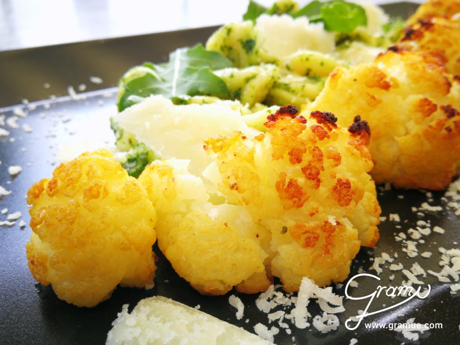Den Karfiol in Röschen zerteilen, in der Gemüsebrühe blanchieren und anschließend abtropfen lassen (nicht abschrecken). Mit Salz, Pfeffer und etwas Öl vermischen und auf ein mit Backpapier ausgelegtes Backblech verteilen. Im vorgeheizten Backrohr (180°C – Heißluft) ca. 30 Minuten fertig garen (dazwischen öfters Wenden, damit er von allen Seiten schön braun wird).