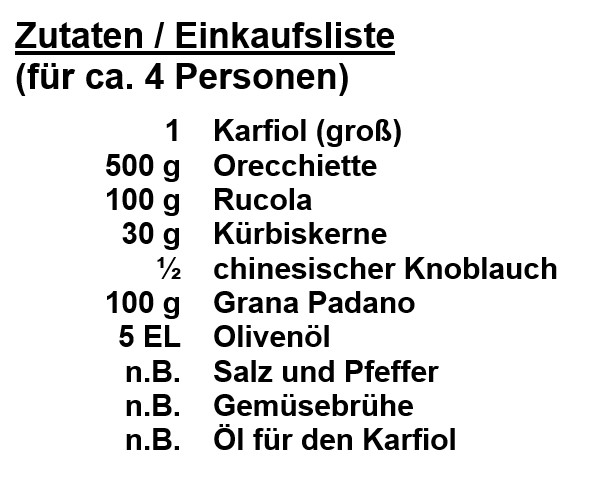 Die Orecchiette nach Anleitung al dente garen und mit dem Pesto vermengen. Gemeinsam mit dem Karfiol servieren und mit Rucola und dem restlichen Grana Padano garnieren.