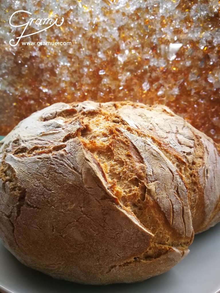 Das Backrohr auf 220°C (Ober- und Unterhitze) vorheizen. Den Brotlaib in eine runden gusseisenform (mit Deckel) geben und im Backrohr für ca. 60 Minuten zugedeckt backen. Danach den Decker herunternehmen und nochmals ca. 15 Minuten fertig backen.