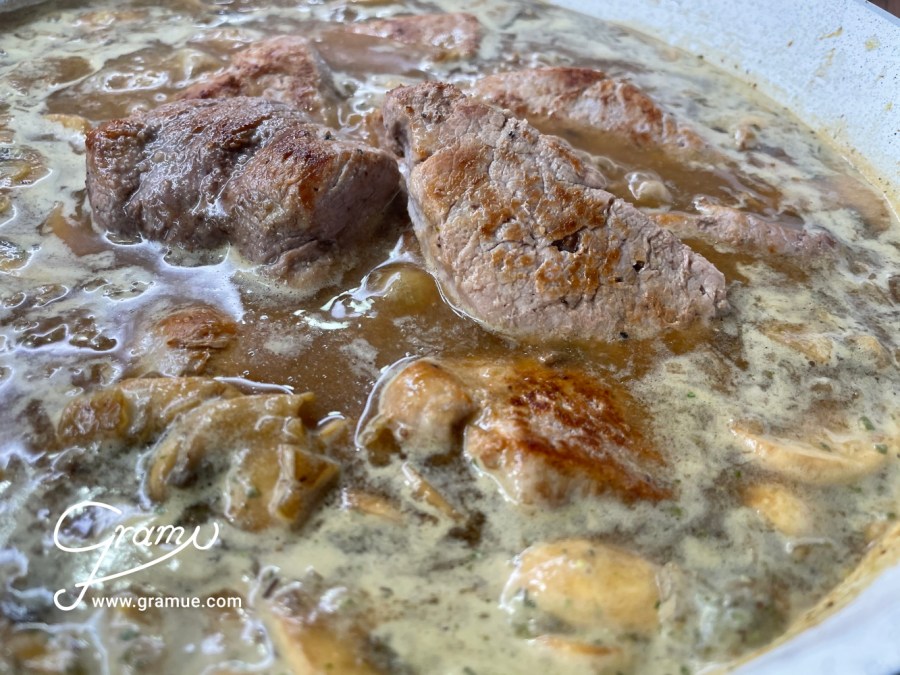 Im verbliebenen Öl die klein gewürfelten Zwiebeln anbraten, die in Scheiben geschnittenen Champignon mitrösten (bis diese kein Wasser mehr abgeben) und danach den feingehackten Knoblauch kurz mitbraten. Den Senf unterrühren und mit dem Mehl stauben. Die Gemüsebrühe angießen und mit Salz, Pfeffer und Majoran würzig abschmecken. Das Fleisch einlegen und das Ganze für ca. 20 min auf kleiner Flamme köcheln.