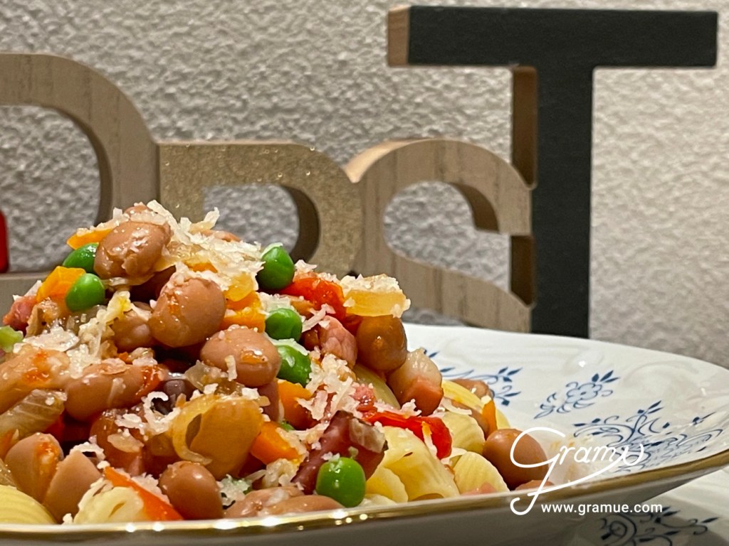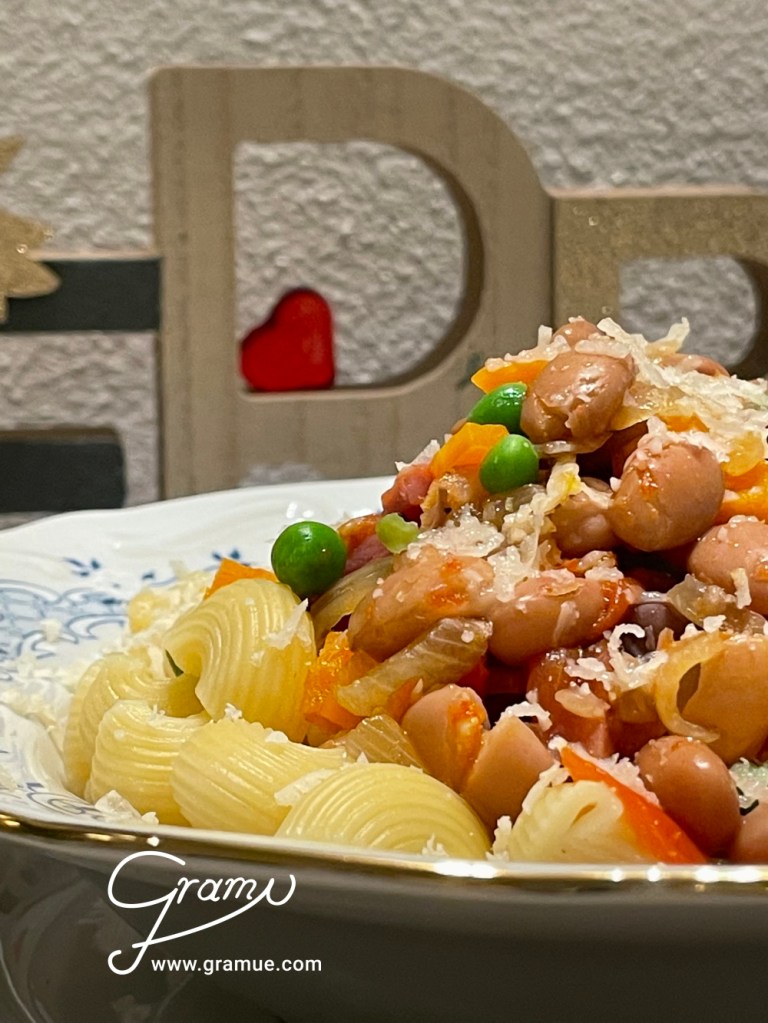 Heute zum Festtag der Nudeln bzw. Pasta gab es eine Eigenkreation auf eine etwas andere Art. Hier treffen Bohnen (fagioli) und Erbsen (piselli) auf Südtiroler Speck und Pipette Rigate. Dazu gab es einen grünen Salat. Damit feiern wir heute den Pastatag.