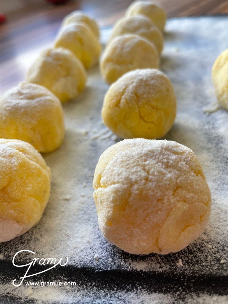 Vom Teig Stücke abtrennen und ca. daumendicke Rollen formen und in ca. 5-7 cm lange Stücke schneiden. Auf ein mit Mehl gestäubten Teller geben und für ca. 1-2 Stunden im Kühlschrank kaltstellen.