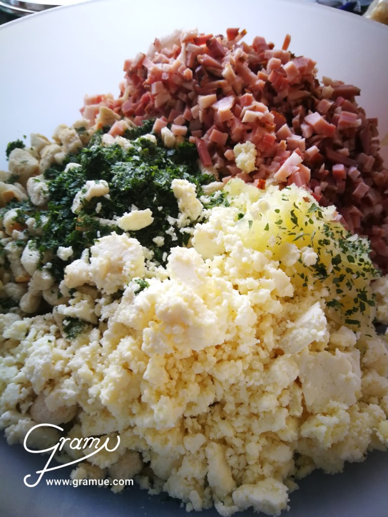 Den Graukäse und den Speck klein würfelig schneiden. Die Eier mit der Milch verquirlen und mit Salz und Pfeffer würzig abschmecken. Die Semmelwürfel mit den geriebenen Kartoffeln, Graukäse und den Speckwürferln, sowie der feingehackten Petersilie vermischen und die „Eiermilch“ darüber gießen und verrühren. Den Knödelteig ca. eine halbe Stunde durchziehen lassen.