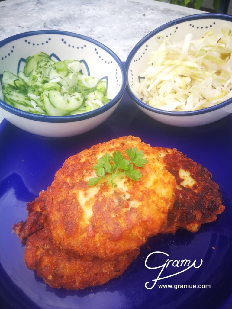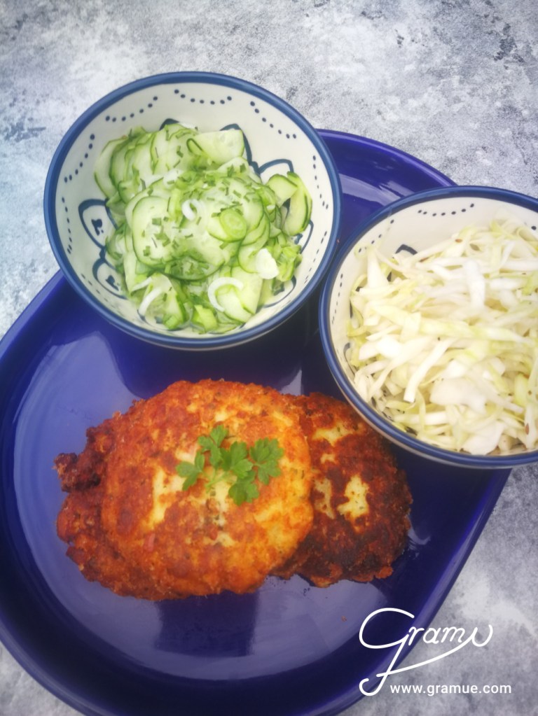 In einer Pfanne reichlich Öl erhitzen (gut bodenbedeckt). Aus dem Teig Knödel formen und diese dann zu Laibchen flach drücken. Auf beiden Seiten knusprig braun ausbacken.
