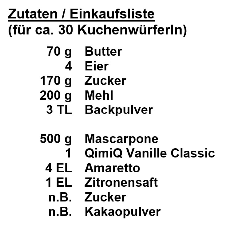 In der Zwischenzeit für die Creme das QimiQ Vanille fest aufschlagen. Mascarpone, Amaretto, Zucker und Zitronensaft unterrühren.