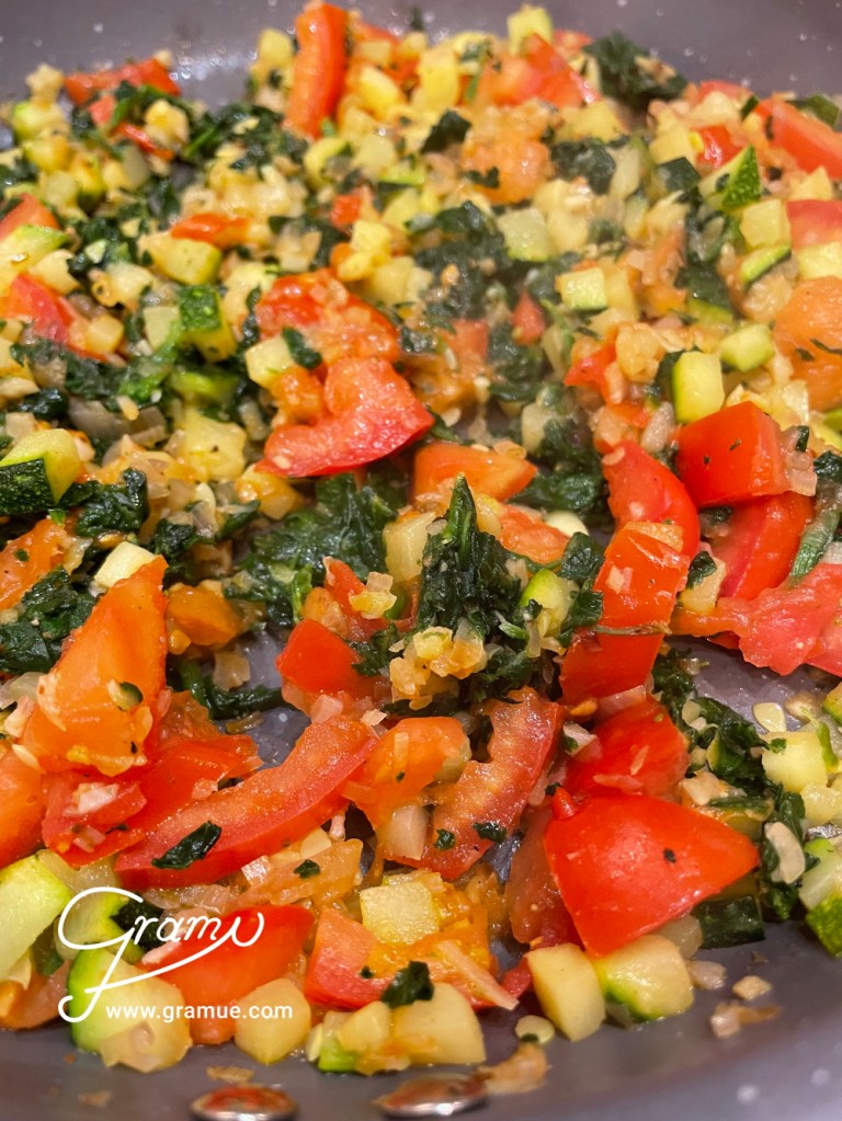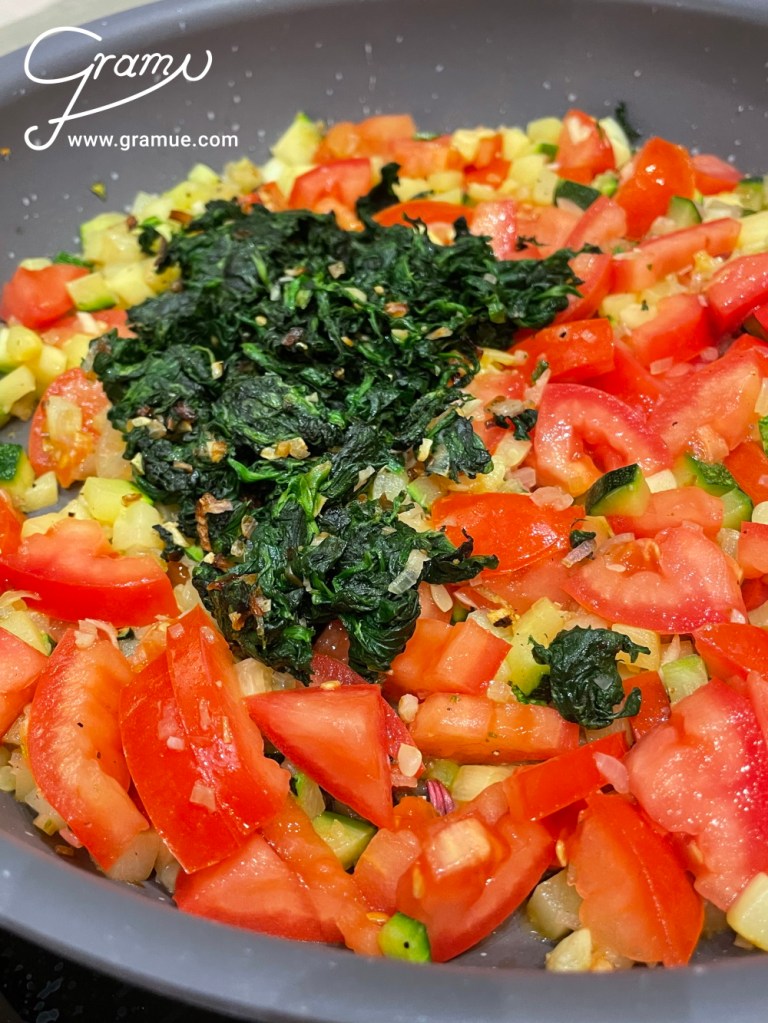 In einer weiteren Pfanne die verbliebenen Schalotten in Olivenöl anrösten, den Zucchini dazugeben und ca. 5 Minuten mitbraten. Danach die in grobe Würfel geschnittenen Tomaten, den restlichen Knoblauch und den Blattspinat dazugeben. Alles nochmals gut durchrühren und etwas köcheln lassen.