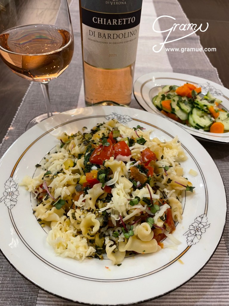 Die vegetarische Gemüsepfanne mit Radieschensprossen (oder auch Kresse), sowie noch etwas Scamorza garnieren und mit Salat nach Wahl (in unserem Fall Gurke/Karotte) servieren. Dazu passt auch hervorragend ein trockener Rosewein – z.B. Chiaretto di Bardolino