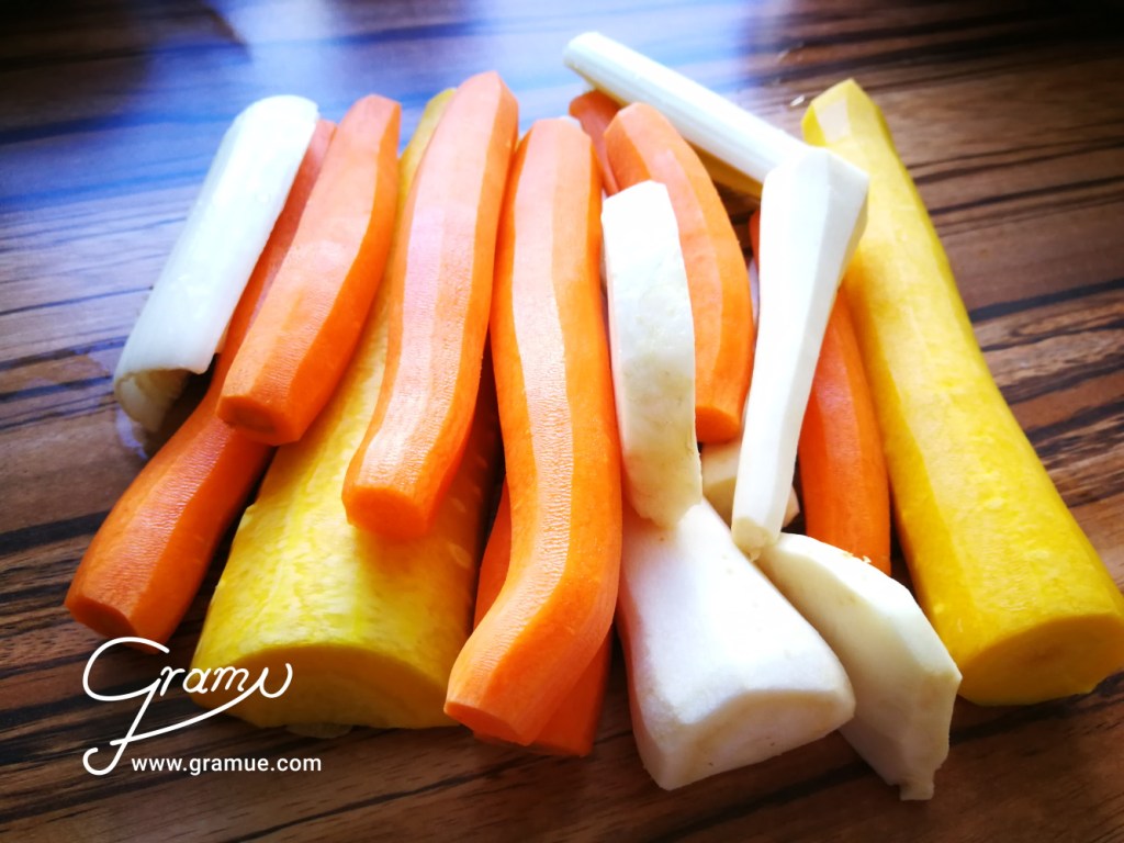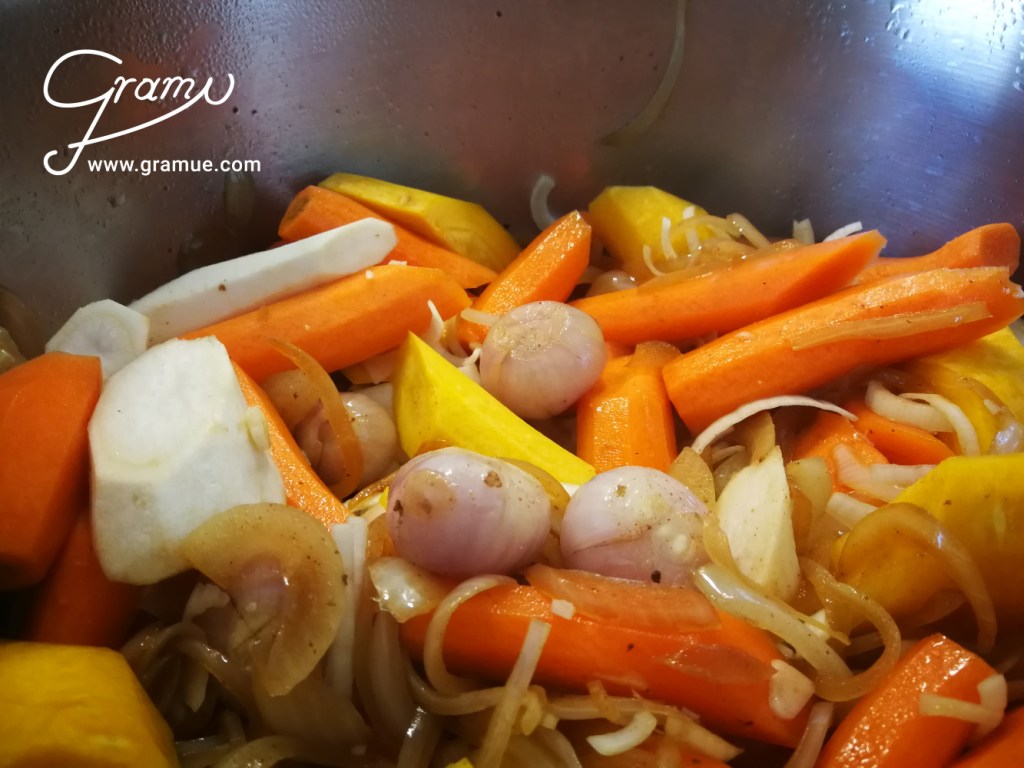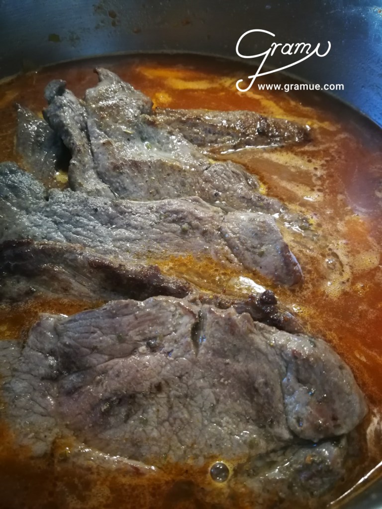 Die restlichen Zutaten, wie Zwiebel, Knoblauch, Karotten und Peterwurze klein schneiden. Öl in einer Pfanne erhitzen und die Rouladen von allen Seiten scharf anbraten und im Backrohr warm stellen. Im verbleibenden Bratenfett die Zwiebel anrösten, Knoblauch und Gemüse kurz mitbraten, das Tomatenmark hinzugeben und ebenfalls kurz mitrösten. Danach mit dem Sherry ablöschen und aufkochen lassen. Mit Brühe und Rama Cremefine aufgießen. Lorbeerblatt, Wacholderbeeren und Nelken dazugeben und mit den restlichen Gewürzen pikant abschmecken. Die Rouladen einlegen und für ca. 1,5 Stunden schmoren lassen (auf kleiner Flamme).
