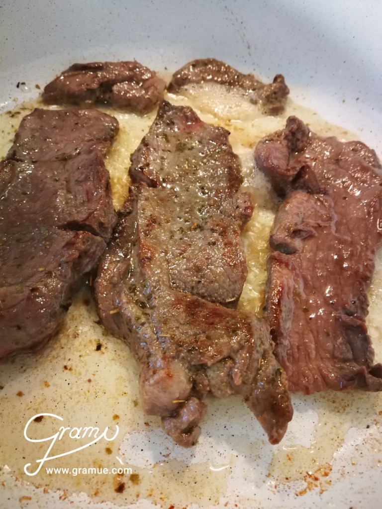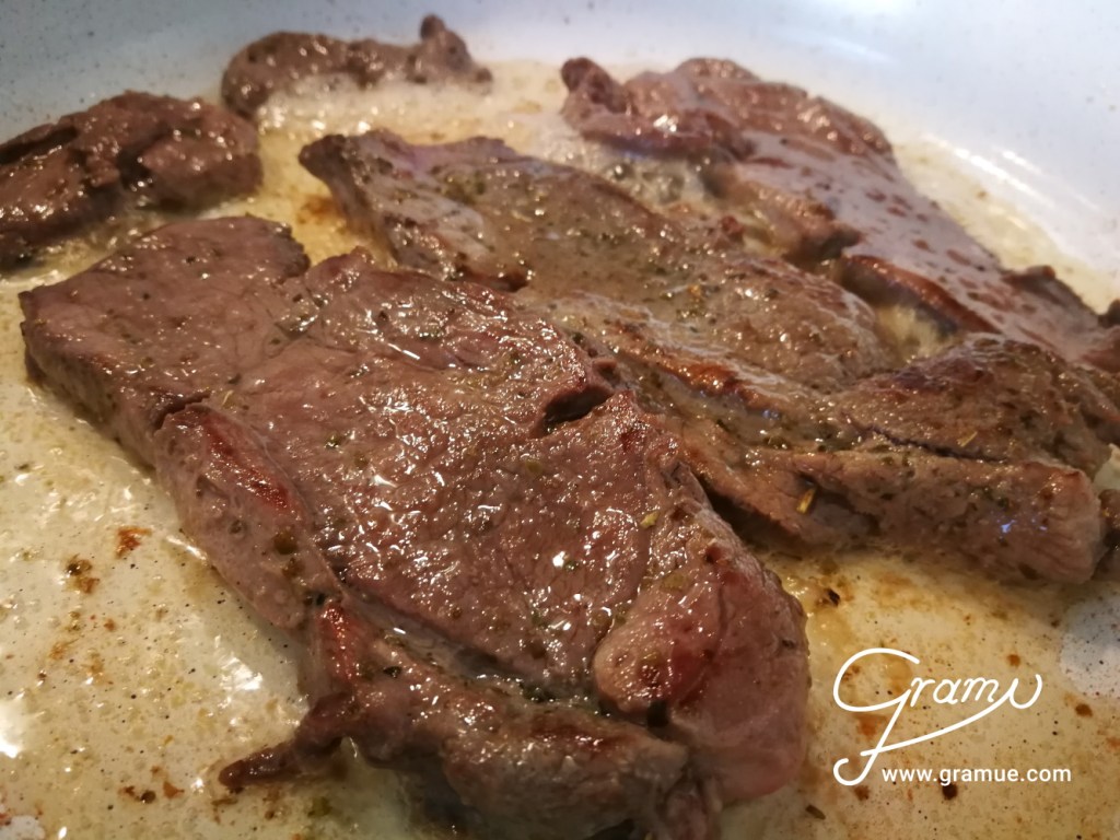 Das Fleisch in einer Marinade aus Öl, Thymian, Majoran, zwei Rosmarinzweige, einem halben, feingehackter Knoblauch, sowie Salz und Pfeffer einlegen und über Nacht einziehen lassen.